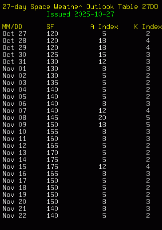 I resolve and populate your coordinates using your IP address.  If not correct, just click your QTH location on map then click "NOW". Select desired mode/map/overlays. Key shows bands. Click "Next Hour" to advance one hour. Enter desired future NOAA/SWPC predicted SFI, A-Index, K-Index, Month, Day, and UTC Time (current NOAA/SWPC 27-day Space Weather Outlook Table provided below), then click "Compute" for future predictions.